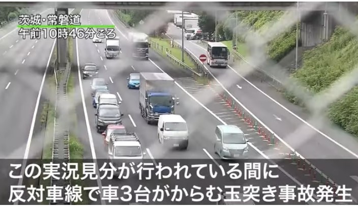 2019年8月31日 茨城県守谷市の常磐道上り線であおり運転傷害事件 の実況見分中 下り線の追い越し車線を走ってきた車が前の車と横のトラックに接触 実況見分の様子を脇見運転か 産業安全と環境問題について考える